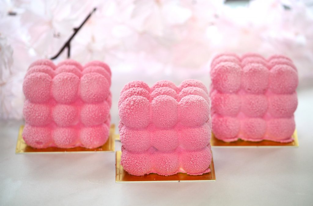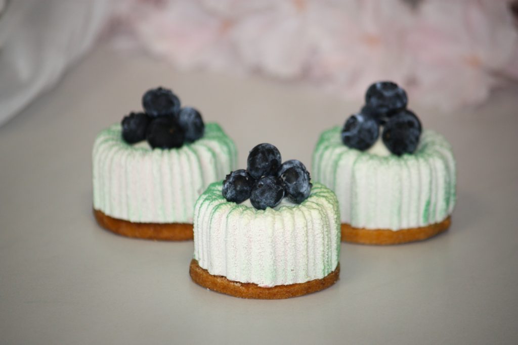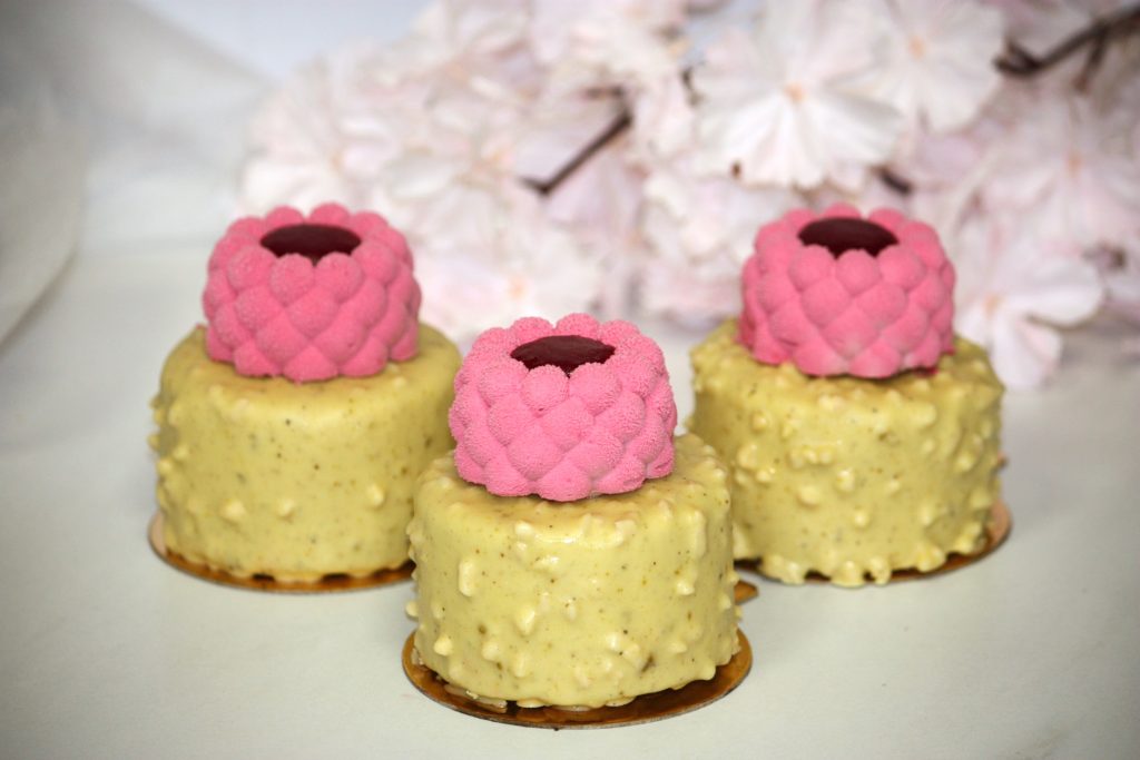 (biszkopt, mus pistacjowy, żelka z malin, mus malinowy)