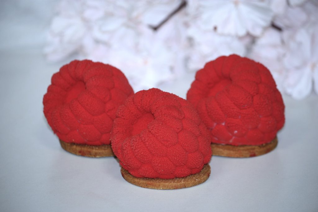 (mus śmietankowy, żelka z malin, chrupka owocowa, biszkopt)
